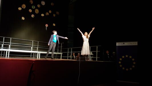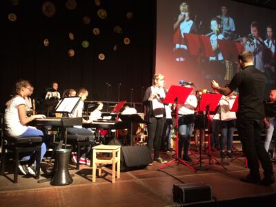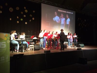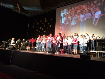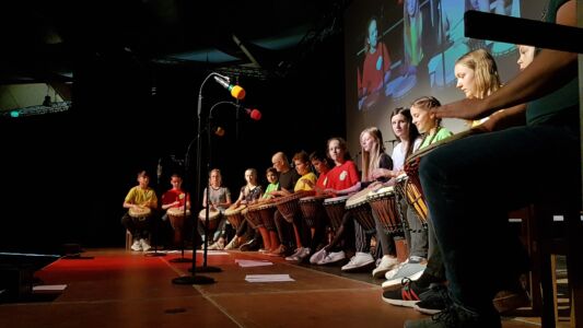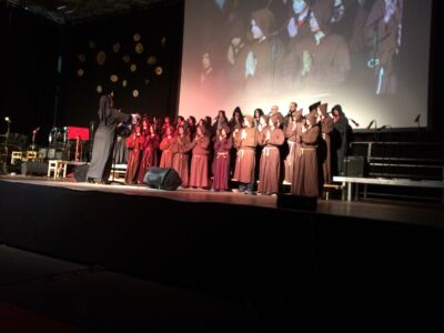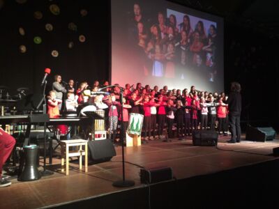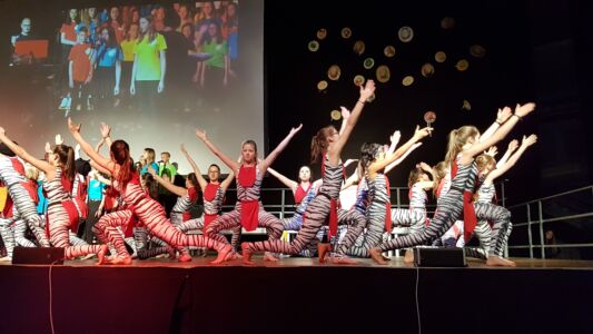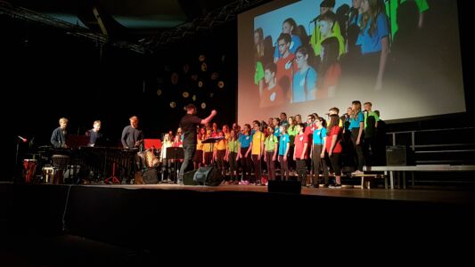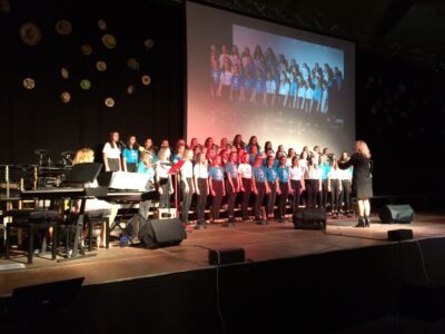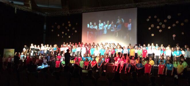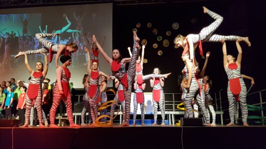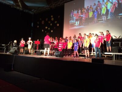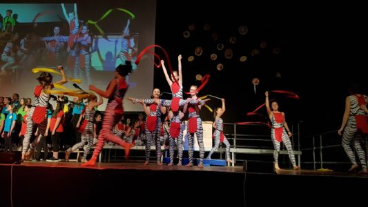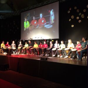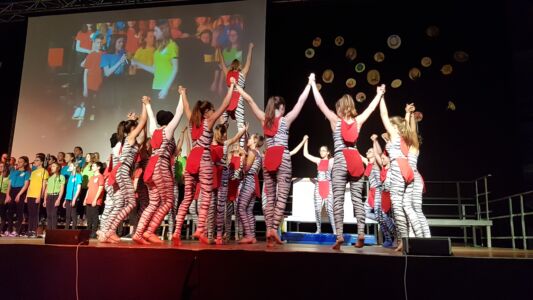 Besonders beeindruckte dabei das Lied „Babayetu“, bei dem Chor, Solistinnen, ein Percussion- Ensemble der Landesmusikschule und Tänzerinnen der 3. und 4. Klassen die gesamte 16 Meter breite Bühne bespielten und sich Tanz, Gesang, Rhythmus und Akrobatik zu einem atemberaubenden Spektakel vereinigten, sodass die Messehalle vor Begeisterung tobte.